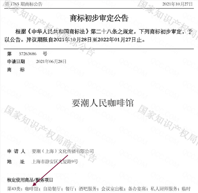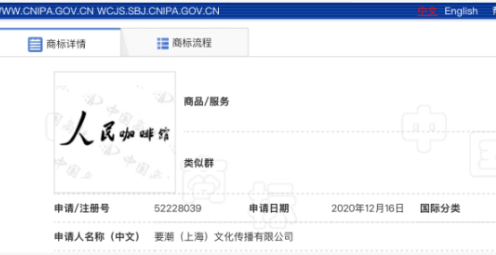 以要潮公司2020年12月申請的第30、43類52228039號“人民咖啡館”為例: