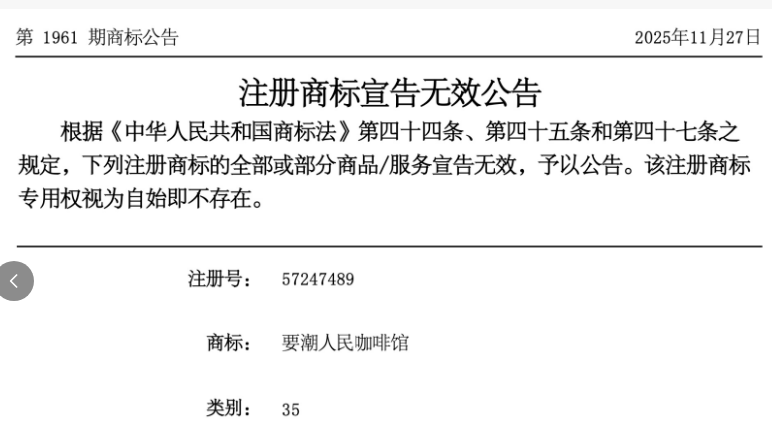 11月27日,最新的第1961期商標(biāo)公告中,上海要潮公司的“要潮人民咖啡館”、“潮人民咖啡館”、“愛人民咖啡館”等六件商標(biāo),被國知局依職權(quán)宣告無效。??