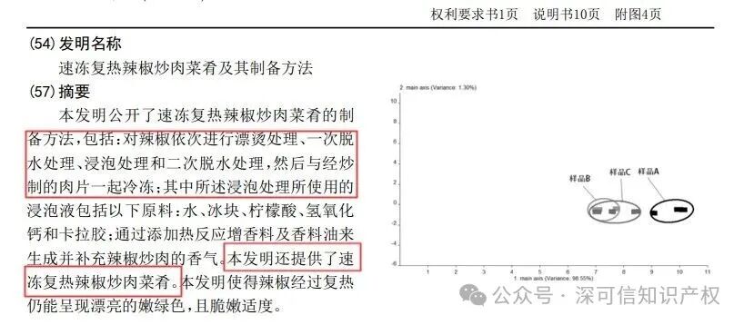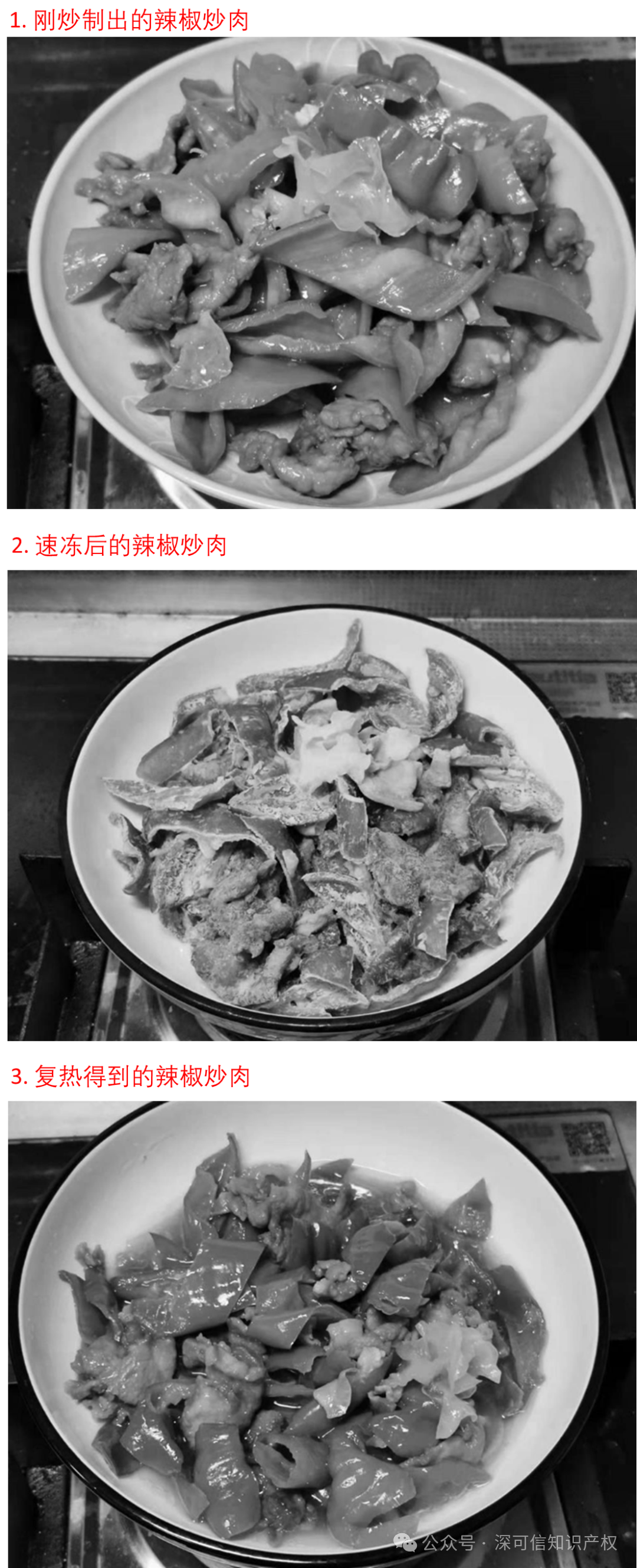 從專利的樣品數(shù)據(jù)來看,西貝對(duì)此應(yīng)該進(jìn)行了反復(fù)的實(shí)驗(yàn),同時(shí)該專利配有多張辣椒炒肉的附圖,從西貝對(duì)比了剛炒出來的辣椒炒肉,速動(dòng)后的辣椒炒肉,以及復(fù)熱后的辣椒炒肉。