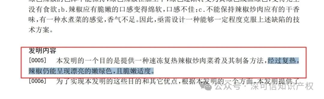 根據(jù)這件專利記載,西貝對(duì)湖南名菜“辣椒炒肉”進(jìn)行了深度研發(fā),因?yàn)槲髫惏l(fā)現(xiàn),“市面上一直未見過工廠化生產(chǎn)的辣椒炒肉,其原因就在于辣椒炒肉的工藝沒有突破”。西貝研發(fā)的核心目標(biāo)的是解決行業(yè)痛點(diǎn):市面上缺乏工廠化生產(chǎn)的辣椒炒肉,要么復(fù)熱后辣椒變深失色,要么口感綿軟如 “水煮菜”。因此,西貝此項(xiàng)發(fā)明的重點(diǎn)在與提供一種速凍復(fù)熱辣椒炒肉菜肴及其制備方法,經(jīng)過復(fù)熱,辣椒仍能呈現(xiàn)漂亮的嫩綠色,且脆嫩適度。