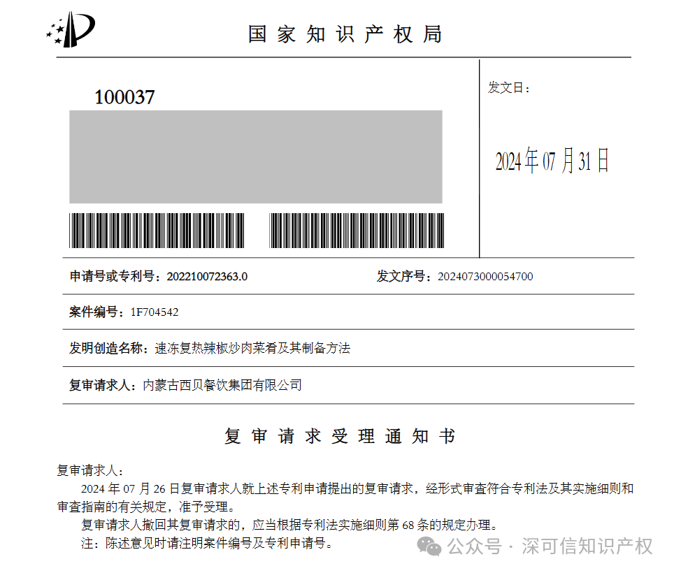 對(duì)于這樣的專利,國家知識(shí)產(chǎn)權(quán)局對(duì)西貝這件專利在2023年7月和2024年1月,先后發(fā)出了兩次意見審查通知書,均認(rèn)為該專利存在不具備創(chuàng)造性而不符合授予專利的缺陷。審查員認(rèn)為其“漂燙 + 脫水 + 特定浸泡液” 的工藝,本質(zhì)上是食品加工領(lǐng)域的常規(guī)手段組合,未形成 “突出的實(shí)質(zhì)性特點(diǎn)”—— 比如檸檬酸用于護(hù)色、卡拉膠用于保形,均為行業(yè)內(nèi)已知技術(shù),缺乏 “非顯而易見” 的創(chuàng)新點(diǎn)。在西貝兩次答復(fù)后,國家知識(shí)產(chǎn)權(quán)局的專利審查員依然認(rèn)為該專利不具備創(chuàng)造性,因此于2024年7月發(fā)出了駁回決定。