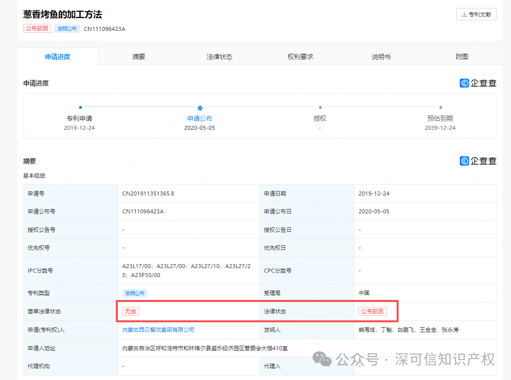 除了辣椒炒肉,西貝早在2023年,就專門給蔥香烤魚、黃米涼糕兩大招牌菜提交了專利申請(qǐng),但顯示是“無效”的狀態(tài)。