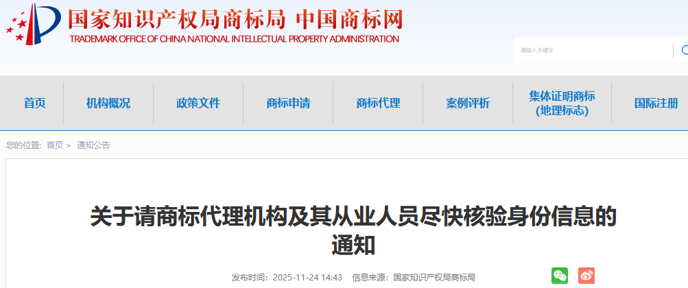 商標(biāo)局:2025年12月12日前完成核驗(yàn)工作。未通過(guò)核驗(yàn)的無(wú)法辦理商標(biāo)業(yè)務(wù)|關(guān)于請(qǐng)商標(biāo)代理機(jī)構(gòu)及其從業(yè)人員盡快核驗(yàn)身份信息的通知